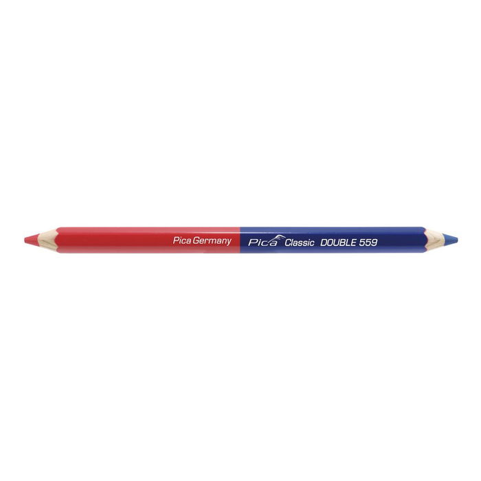 Lápiz de doble punta roja y azul con perfil hexagonal. madera fácil de afilar procedente de bosques de cultivo sostenible. minas de alta calidad de gran diámetro. afilado en ambos lados