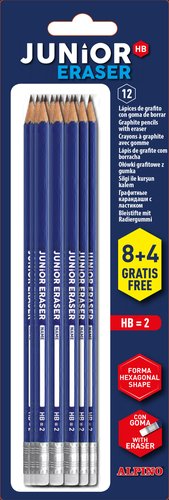 Lápiz de grafito hexagonal con goma, mina HB de ø 2 mm y espacio para personalizar. Un formato perfecto para el cole.