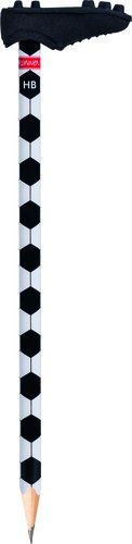 Bote con 24 lápices de grafito de dureza HB decorados en color blanco/negro, como si de un balón de fútbol se tratase, y goma con forma de bota de fútbol. Medidas del lápiz: 180 mm.
