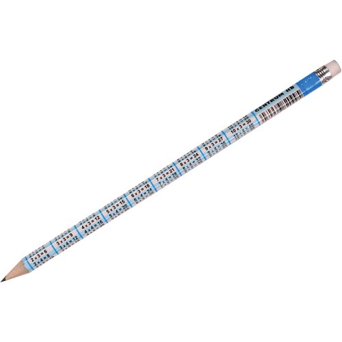 Lápiz de grafito HB con goma blanca y tabla de multiplicar impresa en su cuerpo redondo. Un diseño para escribir, esbozar, dibujar y consultar la tabla de multiplicar cuando lo necesites.