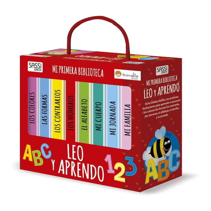 ¡Ocho grandes libros pequeños enseñan conceptos básicos con excelentes imágenes en color! Aprende los colores, las formas, los número del 1 al 10, el alfabeto, los opuestos, los miembros de la familia y las horas del día. Tu primera biblioteca es fácil de transportar. ¡Llévala contigo a todas partes!
