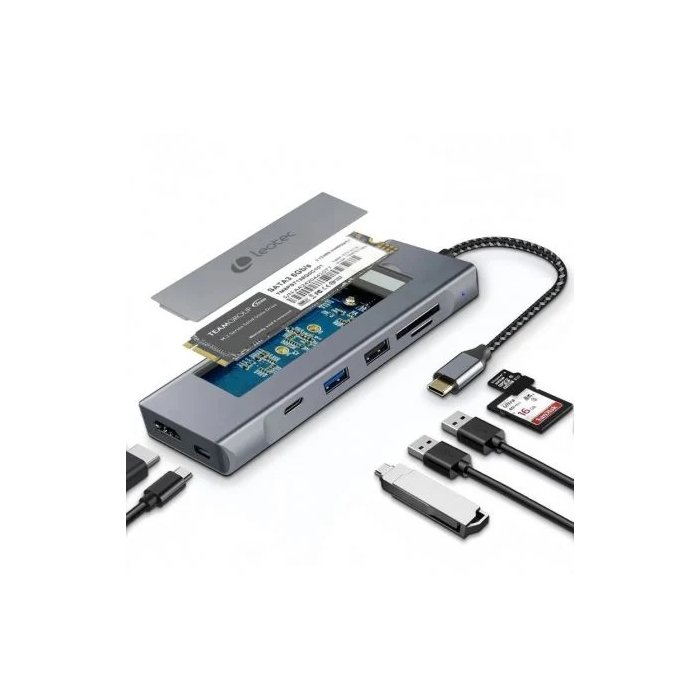 La Docking Station 8 en 1 LEDS07 de Leotec es la solución todo-en-uno perfecta para ampliar las capacidades de tu portátil, tablet o smartphone. Con un diseño compacto y elegante en aluminio, este dispositivo te ofrece 7 puertos de conexión + ranura SSD M.2 integrada, proporcionando máxima versatilidad para trabajo, viajes o entretenimiento.