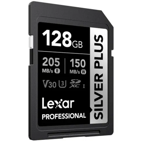 Lexar Professional SILVER PLUS. Capacidad: 128 GB, Tipo de tarjeta flash: SDXC, Clase de memoria flash: Clase 3, Tipo de memoria interna: UHS-I, Velocidad de lectura: 205 MB/s, Velocidad de escritura: 150 MB/s, Clase de velocidad UHS: Class 3 (U3), Clase de velocidad de vídeo: V30. Funciones de protección: Resistente a la temperatura, Protección contra campos magnéticos, Resistente a golpes, A prueba..., Color del producto: Negro, Plata