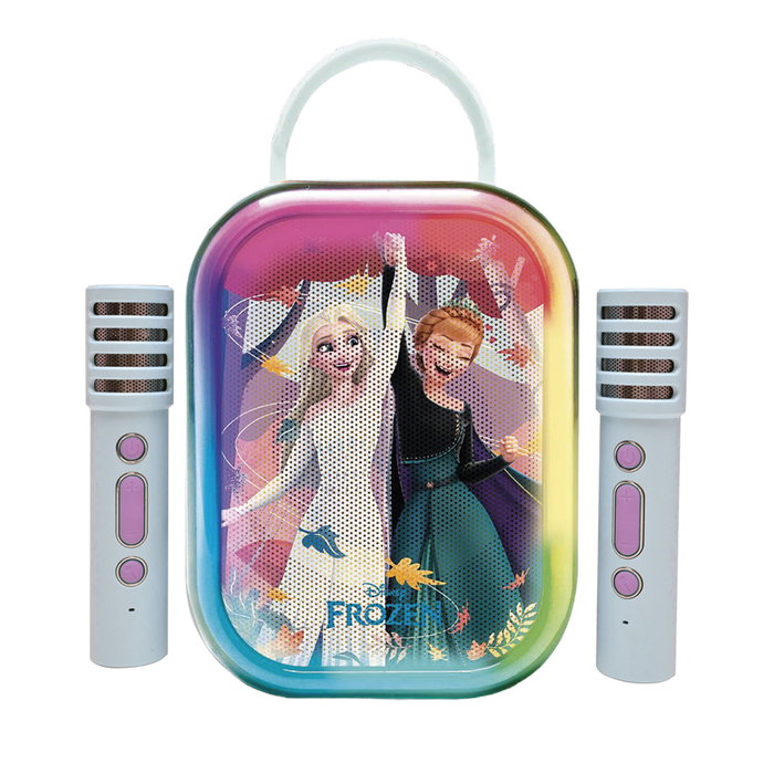 El altavoz de karaoke recargable con temática de Frozen y dos micrófonos está diseñado para niños que adoran cantar y divertirse con sus amigos. El altavoz está equipado con dos micrófonos inalámbricos ubicados directamente en el dispositivo, en un práctico compartimento de almacenamiento, lo que facilita su transporte y almacenamiento. En la parte posterior del altavoz se encuentra un panel de control con botones para ajustar el volumen, seleccionar el modo y otras funciones, incluyendo un botón para activar efectos de luz que añaden un toque visual divertido al cantar.
