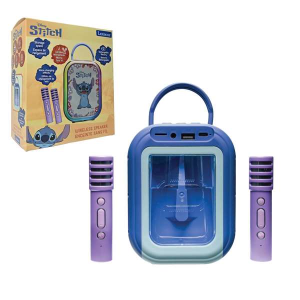 - Contenido caja: Karaoke Bluetooth rosa con 2 micrófonos inalámbricos de Stitch