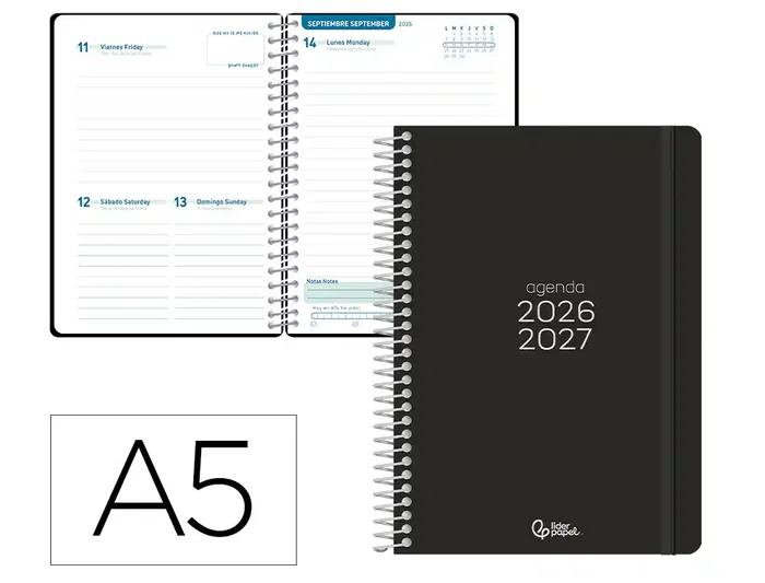 Liderpapel Agenda Escolar 2026-2027 Básica A5 Bilingüe Espiral Día Página Negro – Tapa de Polipropileno, Papel FSC 70g, Ideal para Organización Escolar