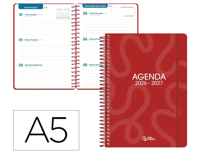 Liderpapel Agenda Escolar 2026-2027 Espiral Classic Semana Vista A5 Bilingüe, Papel FSC 70g, Color Rojo