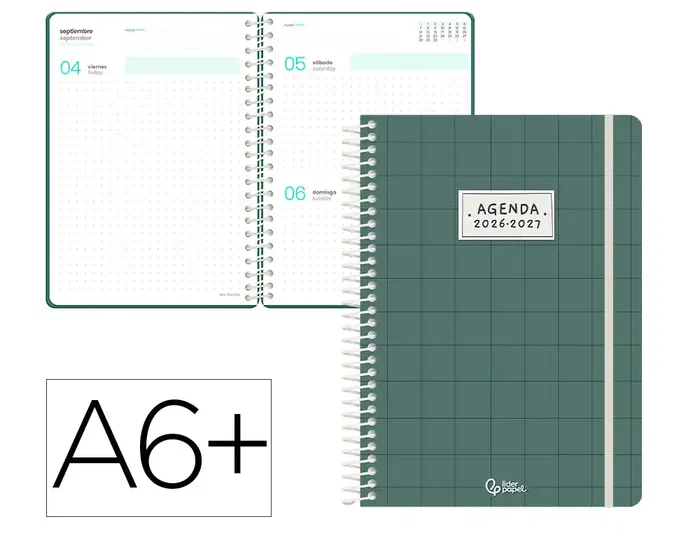 La colección Liderpapel FANTASY E de agendas escolares 2026-2027 juega con distintas portadas con tipografías y estilos variados, disponibles en tapa dura de cartón forrado con gomilla. Disponible en formati día página y tamaños A5 y A6. Una opción versátil ademas de atractiva. interior bilingüe dinámico y práctico, con diseño punteado. Incluye calendario bianual, 3 hojas de horario semanal, cuadro de profesorado y sección de calificaciones. Además, cuenta con un apartado de notas personales y secciones adicionales para contactos, libros, películas y series. Incluye 3 hojas de pegatinas. Características: AGENDA ESCOLAR 26-27, COLOR LINES, ESPIRAL, TAPA DE CARTON, DIA PAGINA, A6+, PAPEL FSC92G , INTERIOR BILINGÜE, CON GOMILLA,LA, PEGATINAS.