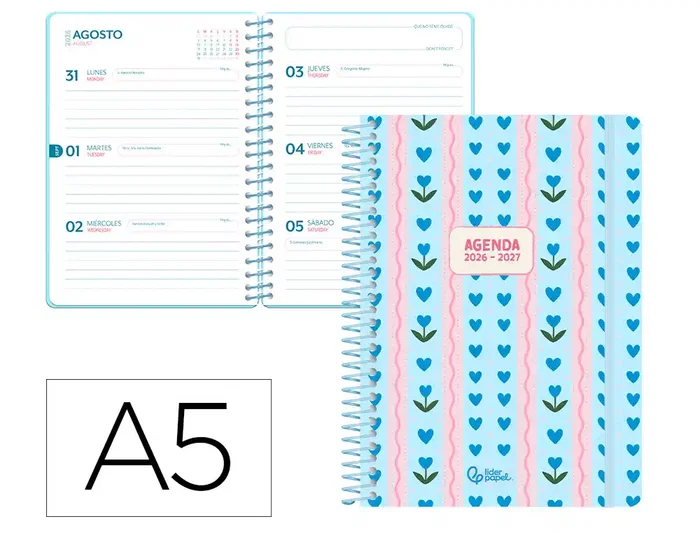 Las agendas escolares 2026-2027 Liderpapel FANTASY A son una opción ideal para organizarte a tu ritmo. Cuentan con un diseño de portada en colores pastel con un delicado motivo, disponibles en día página o semana vista. En con tapa dura de carton forrado con gomilla, disponible en dia pagina y semana vista en A5. interior bilingüe pensado para estudiantes y docentes combinando organización académica con apartados prácticos para el día a día. Incluye calendario bianual, horario semanal, planning mensual, cuadro de profesorado y espacio para fechas importantes. Además, cuenta con un apartado de recordatorio y secciones adicionales para contactos, libros, películas y series. Características: AGENDA ESCOLAR 26-27, COLOR AZUL CORAORAZONES, ESPIRAL, TAPA DE CARTON, SEMANA VISTA, A5, PAPEL FSC80G , INTERIOR BILINGÜE, CON GOMILLA.