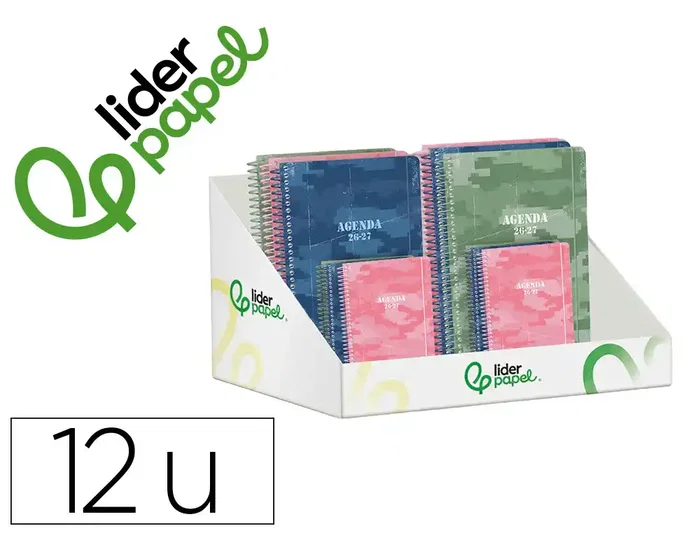 Las agendas escolares 2026-2027 Liderpapel Military están pensadas para los más aventureros y conforman una de las colecciones más versátiles. Disponible en varios formatos (día página y semana vista) y tamaños (A5 y A6), están hechas para amoldarse a tus necesidades. Encuentrala en 3 distintos colores. Con tapa dura de cartón forrado y gomilla. Surtido de 12 unidades: 3 A5 Semana Vista, 3 A5 Día Página, 3 A6 Semana Vista, 3 A6 Día Página.