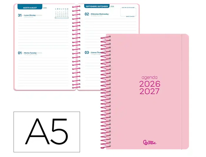 Prepárate para el nuevo curso con la agenda escolar 2026-2027 de Liderpapel. Esta herramienta esencial te ayudará a mantener tus tareas y actividades organizadas, evitando el caos típico del año escolar. Con su diseño práctico y su contenido funcional, es perfecta para comenzar el curso con buen pie. Cuenta con tapa hecha de polipropileno, resistente y flexible para proteger las páginas inteiroes y gomilla para mantenerla cerrada y segura. Descubre los diferentes colores de la colección. El interior bilingüe tiene un diseño limpio y funcional que reúne todo lo necesario para una organización práctica del día a día. Incluye calendario bianual, horario semanal, planning mensual, cuadro de profesorado y espacio para fechas importantes. Además, cuenta con calificador del día y apartado de notas, junto con secciones adicionales para contactos, libros, películas y series. Todo lo esencial, en un formato claro y cómodo. Características: AGENDA ESCOLAR 26-27, COLOR ROSA, ESPIRAL, TAPA DE POLIPROPILENO, 2 DIAS PAGINA, A5, PAPEL FSC70G , INTERIOR BILINGÜE, CON GOMILLA.