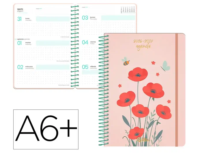 La colección de agendas escolares 2026-2027 Liderpapel FANTASY D una selección de portadas florales, diponibles en distintos tamaños y formatos, adaptándose a distintos perfiles. Con tapa dura de cartón forrado y gomilla. interior bilingüe dinámico y práctico, con diseño punteado. Incluye calendario bianual, 3 hojas de horario semanal, cuadro de profesorado y sección de calificaciones. Además, cuenta con un apartado de notas personales y secciones adicionales para contactos, libros, películas y series. Características: AGENDA ESCOLAR 26-27, COLOR ROJO, ESPIRAL, TAPA DE CARTON, SEMANA VISTA, A6+, PAPEL FSC80G , INTERIOR BILINGÜE, CON GOMILLA.