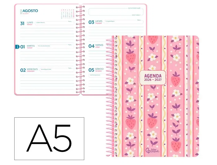 Las agendas escolares 2026-2027 Liderpapel FANTASY A son una opción ideal para organizarte a tu ritmo. Cuentan con un diseño de portada en colores pastel con un delicado motivo, disponibles en día página o semana vista. En con tapa dura de carton forrado con gomilla, disponible en dia pagina y semana vista en A5. interior bilingüe pensado para estudiantes y docentes combinando organización académica con apartados prácticos para el día a día. Incluye calendario bianual, horario semanal, planning mensual, cuadro de profesorado y espacio para fechas importantes. Además, cuenta con un apartado de recordatorio y secciones adicionales para contactos, libros, películas y series. Características: AGENDA ESCOLAR 26-27, COLOR ROSA FRESRESAS, ESPIRAL, TAPA DE CARTON, SEMANA VISTA, A5, PAPEL FSC80G , INTERIOR BILINGÜE, CON GOMILLA.