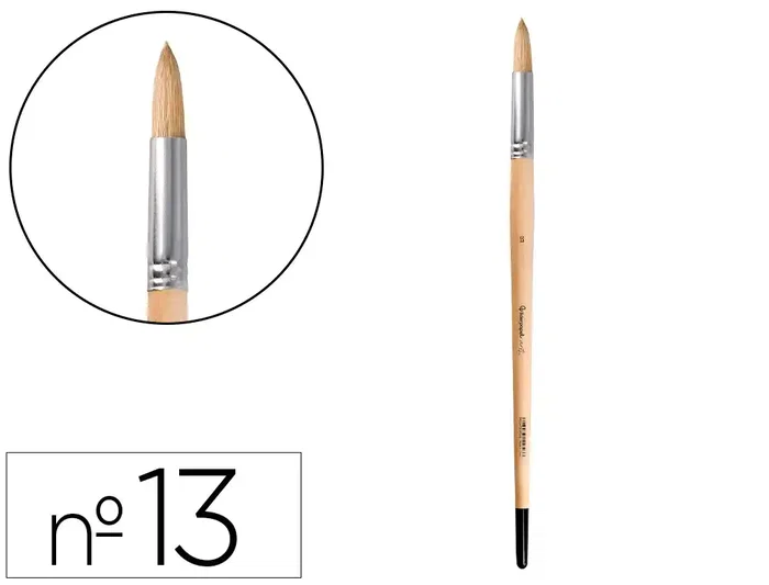 Pincel para pintura al óleo y acrílica Liderpapel nº 13 punta redonda de pelo de cerda certificado FSC. Diseñados para su uso con pintura al óleo y acrílica. Los pinceles de pelo de cerda están hechos de cerdas naturales, generalmente de cerdo, que son rígidas y duraderas. Son ideales para técnicas que requieren una aplicación de pintura más vigorosa y texturizada. Estos pinceles son excelentes para trabajar con pinturas más espesas, como óleos y acrílicos, ya que pueden sostener y distribuir grandes cantidades de pintura de manera uniforme. Las cerdas rígidas permiten crear efectos de textura y pinceladas visibles, lo que es perfecto para estilos de pintura expresivos y dinámicos. Los pinceles de punta redonda tienen cerdas que fe forman una punta afilada, lo que los hace ideales para detalles finos y líneas precisas. Son muy versátiles y se pueden usar para una variedad de técnicas, desde trazos delicados hasta rellenos más amplios cuando se presl pincel. La forma redonda permite un