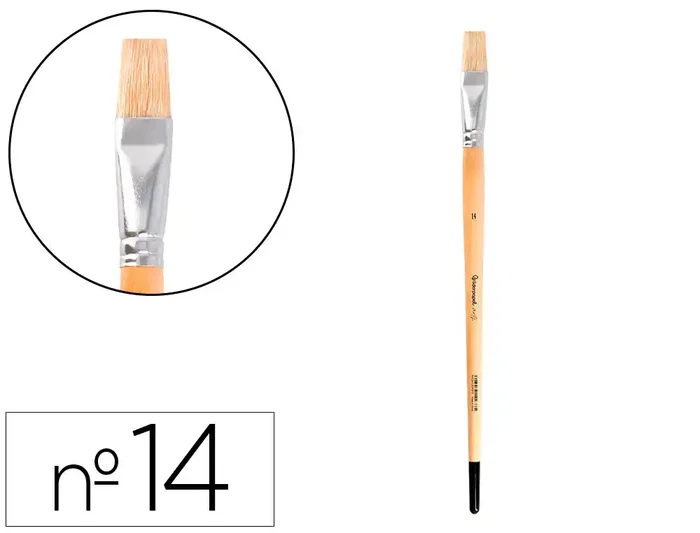 Pincel para pintura al óleo y acrílica Liderpapel nº 14 punta plana de pelo de cerda certificado FSC. Diseñados para su uso con pintura al óleo y acrílica. Los pinceles de pelo de cerda están hechos de cerdas naturales, generalmente de cerdo, que son rígidas y duraderas. Son ideales para técnicas que requieren una aplicación de pintura más vigorosa y texturizada. Estos pinceles son excelentes para trabajar con pinturas más espesas, como óleos y acrílicos, ya que pueden sostener y distribuir grandes cantidades de pintura de manera uniforme. Las cerdas rígidas permiten crear efectos de textura y pinceladas visibles, lo que es perfecto para estilos de pintura expresivos y dinámicos. Los pinceles de punta plana tienen cerdas dispuestastas en una forma rectangular, lo que los hace ideales para crear trazos amplios y definidos. Son perfectos para cubrir grandes áreas de color de manera uniforme y para realizar líneas rectas y bordes nítidos. Además, los lanos son muy útiles para técnicas de