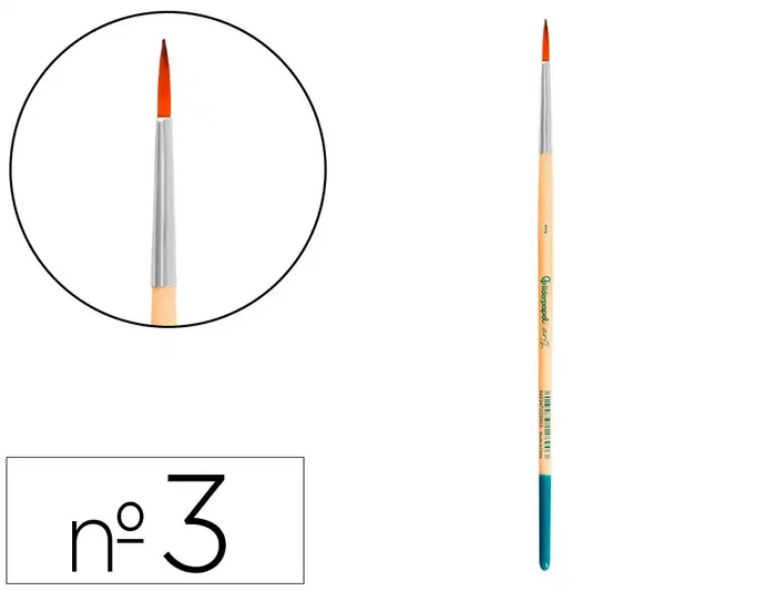 Pincel para pintura acrílica y acuarela Liderpapel nº 3 punta redonda de pelo sintético certificado FSC. Diseñados para su uso con pintura acrílica,acuarela y gouache/témpera, están hechos para ser fuertes, resistentes y flexibles. La mezcla de filamentos sintéticos proporciona una excelente respuesta y control para la aplicación más gruesa del color, manteniendo la forma sin importar la cantidad de agua utilizada. Los pinceles de punta redonda están diseñados para ofrecer una excelente precisión en aplicaciones lineales delicadas. Gracias a su forma, son ideales para detalles finos y trabajos que requieren un control preciso del trazo. La punta redonda permite una aplicación suave y uniforme del color. Disponibles en 19 tamaños os diferentes lo que los hace perfectos para técnicas que requieren líneas definidas y detalles minuciosos.