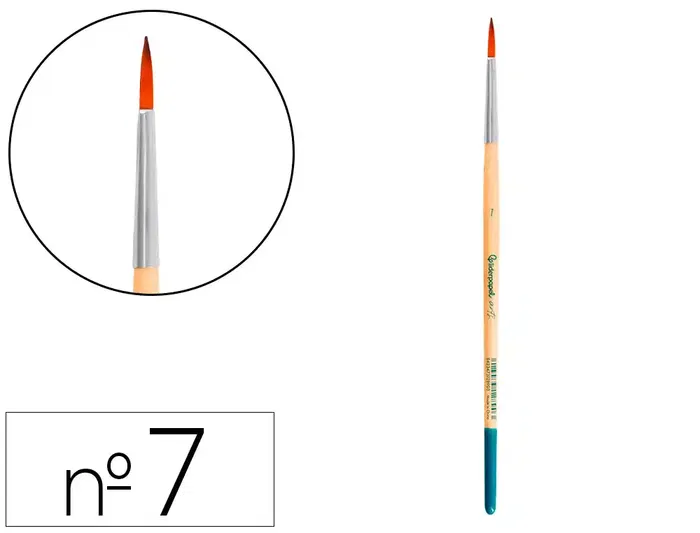 Pincel para pintura acrílica y acuarela Liderpapel nº 7 punta redonda de pelo sintético certificado FSC. Diseñados para su uso con pintura acrílica,acuarela y gouache/témpera, están hechos para ser fuertes, resistentes y flexibles. La mezcla de filamentos sintéticos proporciona una excelente respuesta y control para la aplicación más gruesa del color, manteniendo la forma sin importar la cantidad de agua utilizada. Los pinceles de punta redonda están diseñados para ofrecer una excelente precisión en aplicaciones lineales delicadas. Gracias a su forma, son ideales para detalles finos y trabajos que requieren un control preciso del trazo. La punta redonda permite una aplicación suave y uniforme del color. Disponibles en 19 tamaños os diferentes lo que los hace perfectos para técnicas que requieren líneas definidas y detalles minuciosos.