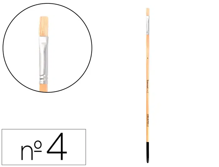 Pincel para pintura al óleo y acrílica Liderpapel nº 4 punta plana de pelode cerda certificado FSC. Diseñados para su uso con pintura al óleo y acr ílica. Los pinceles de pelo de cerda están hechos de cerdas naturales, generalmente de cerdo, que son rígidas y duraderas. Son ideales para técnicas que requieren una aplicación de pintura más vigorosa y texturizada. Estos pinceles son excelentes para trabajar con pinturas más espesas, como óleos y acrílicos, ya que pueden sostener y distribuir grandes cantidades de pintura de manera uniforme. Las cerdas rígidas permiten crear efectos de textura y pinceladas visibles, lo que es perfecto para estilos de pintura expresivos y dinámicos. Los pinceles de punta plana tienen cerdas dispuestastas en una forma rectangular, lo que los hace ideales para crear trazos amplios y definidos. Son perfectos para cubrir grandes áreas de color de manera uniforme y para realizar líneas rectas y bordes nítidos. Además, los panos son muy útiles para técnicas de e