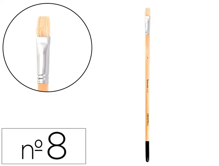 Pincel para pintura al óleo y acrílica Liderpapel nº 8 punta plana de pelode cerda certificado FSC. Diseñados para su uso con pintura al óleo y acr ílica. Los pinceles de pelo de cerda están hechos de cerdas naturales, generalmente de cerdo, que son rígidas y duraderas. Son ideales para técnicas que requieren una aplicación de pintura más vigorosa y texturizada. Estos pinceles son excelentes para trabajar con pinturas más espesas, como óleos y acrílicos, ya que pueden sostener y distribuir grandes cantidades de pintura de manera uniforme. Las cerdas rígidas permiten crear efectos de textura y pinceladas visibles, lo que es perfecto para estilos de pintura expresivos y dinámicos. Los pinceles de punta plana tienen cerdas dispuestastas en una forma rectangular, lo que los hace ideales para crear trazos amplios y definidos. Son perfectos para cubrir grandes áreas de color de manera uniforme y para realizar líneas rectas y bordes nítidos. Además, los panos son muy útiles para técnicas de e