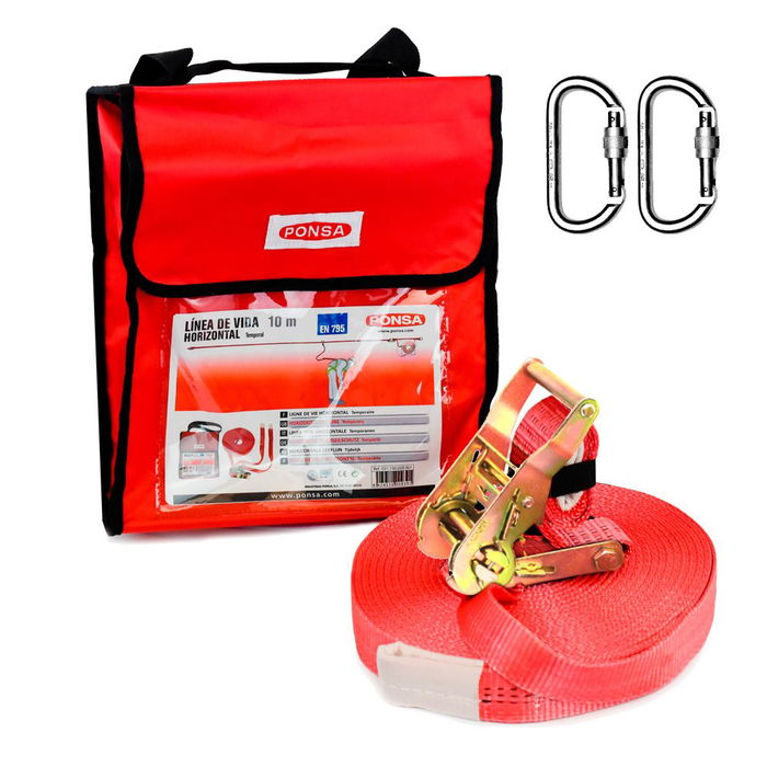 Línea de vida horizontal 10 m 031,150,010,001 la línea vida horizontal dispone de un sistema tensor que permite además de tensar, ajustar a la longitud necesaria quedando la cinta sobrante recogida en la bolsa que lleva incorporada. fácil de instalar y ligera.para el uso con dos operarios aconsejamos un punto de anclaje entre ellos. temperatura de uso: -40ºc a 80ºc. en 795:2012 tipo b cen-ts 16415:2013 materiales :parte textiles: banda de poliéster 100% de 35mm de ancho.partes metálicas: tensor: aleación de acero con acabado anticorrosivo (zincado)mosquetón: aluminio, aisi 14135, aisi 1215 acabado anticorrosivo (zincado)