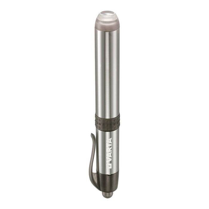 Linterna varta pen light. linterna extremadamente fina y ligera con carcasa de aluminio. led blanco de 5mm que ofrece un haz de luz mejor. practica pinza de sujecion. peso con pilas 27.5g, longitud 117mm, diametro del cabezal 14mm. rango del foco: hasta 11m. duracion hasta 15h. potencia total del alumbrado hasta 3 lumens. 1xhigh energy aaa incluida