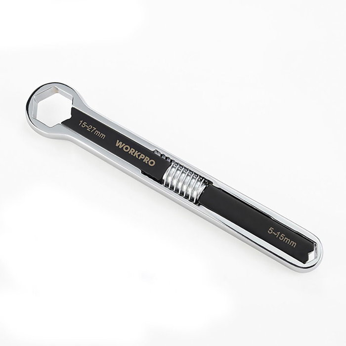 Llave ajustable universal, métrica y sae, 5 - 27 mm. se utiliza para quitar pernos redondeados oxidado o pintado, de acero forjado cromo vanadio. apertura de la mandíbula: 7 - 22 mm, textura antideslizante. girar para ajustar el tamaño