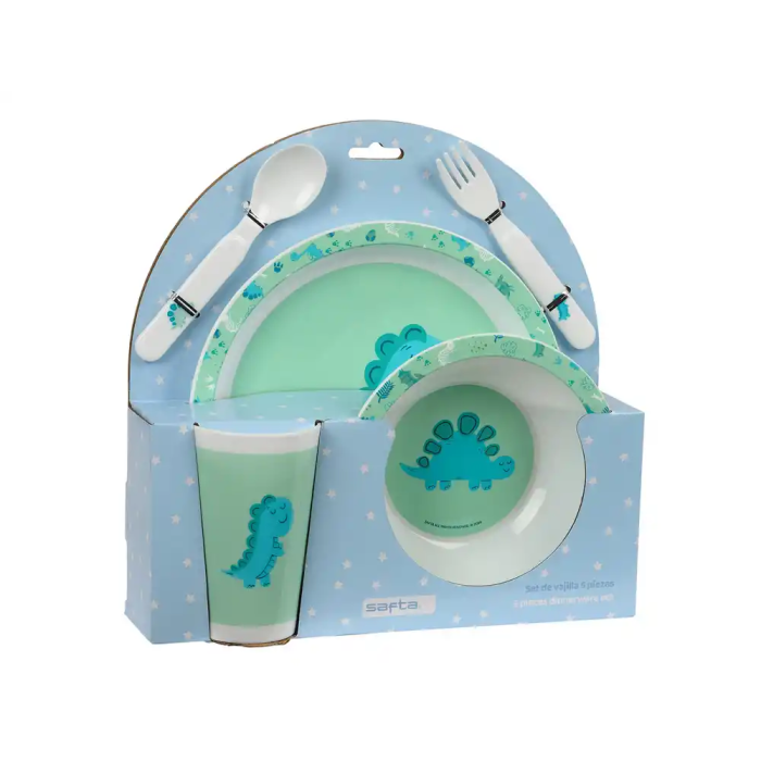 El Set de Vajilla Infantil Safta "Dino" es una opción ideal para los más pequeños, diseñada con un enfoque en la diversión y la funcionalidad. Este set de vajilla infantil incluye platos, cubiertos y un vaso, todo con un encantador diseño de dinosaurios que hará que las comidas sean momentos de alegría. Con unas dimensiones de 26x26x9 cm, este juego es perfecto para las manos infantiles, facilitando que los niños aprendan a comer de forma independiente. Fabricado con materiales de alta calidad, su durabilidad asegura un uso prolongado, resistiendo los inevitables golpes y caídas del día a día. Cada pieza es ligera y fácil de manejar, ideal para fomentar la autonomía de los niños en la mesa. Además, su diseño atractivo no solo capta la atención, sino que también anima a los pequeños a participar en la hora de la comida con entusiasmo. Sin duda, este set combina diversión y practicidad, convirtiéndolo en un complemento imprescindible para las comidas de tus pequeños.