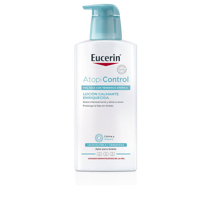 Hidratante corporal Eucerin Atopicontrol loción corporal 12% omega. Esta loción corporal especializada de Eucerin está formulada para proporcionar un cuidado intensivo a la piel seca, sensible y atópica. Ofrece alivio de las molestias de la dermatitis atópica gracias a su acción calmante y su capacidad para reducir la aspereza cutánea.