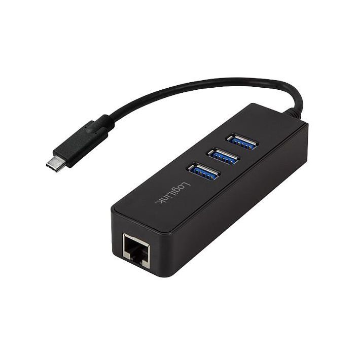 LogiLink UA0283 Adaptador USB 3.0 a Ethernet Gigabit con 3 Puertos USB 3.0, USB-C a 1x RJ45, 1000 Mbit/s, Plug and Play, Negro