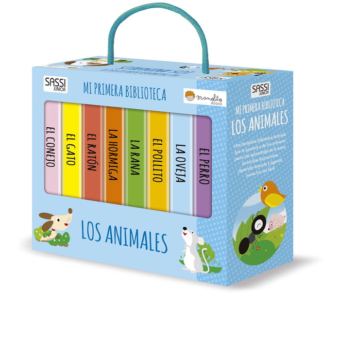 Ocho fantásticos libritos te enseñan todo sobre la naturaleza y los animales con imágenes en color. Conejos, hormigas, perros, ovejas, ranas, polluelos, mariquitas, ratones y una gata y sus gatitos. Tu primera biblioteca es fácil de transportar. ¡Llévala a todas partes!