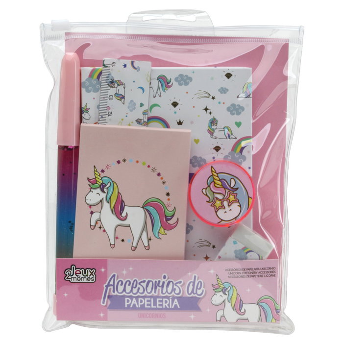 - ¡Este juego de accesorios de papelería hará las delicias de los niños! Con temática de unicornios.