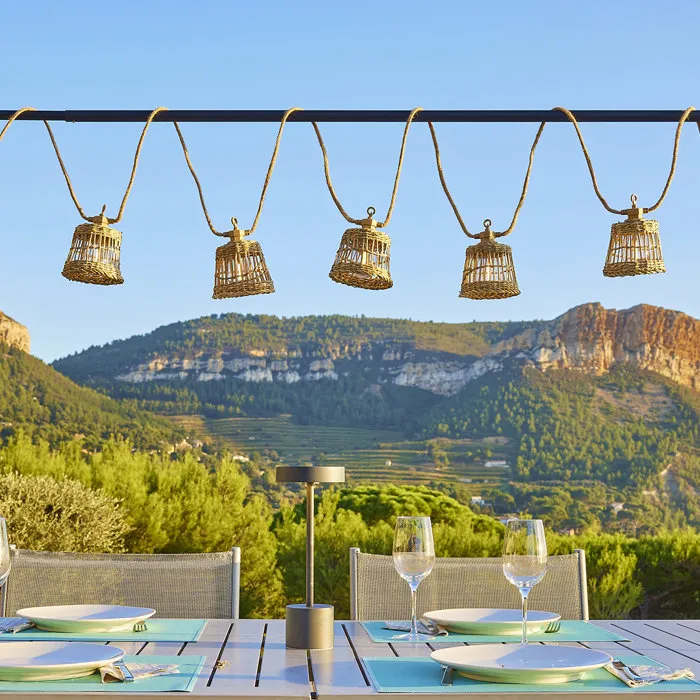 Lumisky LUM1714508567337 Guirnalda de Luces LED Híbrida para Exteriores - 10 Pantallas de Ratán - Alimentación Solar y Eléctrica - Blanco Cálido - 8 Metros