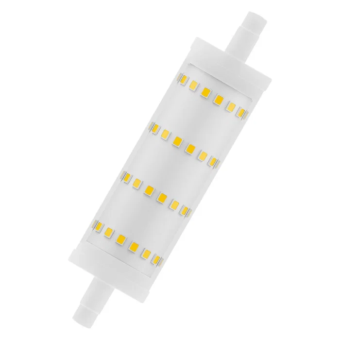 Lámparas LED especiales de doble terminal. Características del producto: Alternativa LED para lámparas tradicionales R7. Buena calidad de luz; índice de reproducción cromática ≥ 80; cromaticidad constante. Beneficios del producto: Encaja en la matoria de las luminarias R7 gracias a su base excéntrica. Buena emisión de luz para todas las situaciones. Larga vida útil de hasta 15 000 h. Carga térmica más baja (en comparación con el producto de referencia estándar). Cuatro años de garantía. Áreas de aplicación: Iluminación general en temperaturas ambiente que vayan desde los -20 a los +40. Hospitalidad. Aplicaciones domésticas. Uso al aire libre únicamente en luminarias exteriores adecuadas.