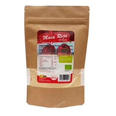 Composicion: Maca roja en polvo ecológica secada al sol. Valor nutricional por 100 g: Energía: 1431 Kj / 342 Kcal Grasas: <0,10g De las cuales saturadas: <0,10g Hidratos de carbono: 67,20g De los cuales azúcares: 24,20 Proteína: 16g Fibra: 10g Sal: 0g *Puede contener frutos de cáscara y sésamo.