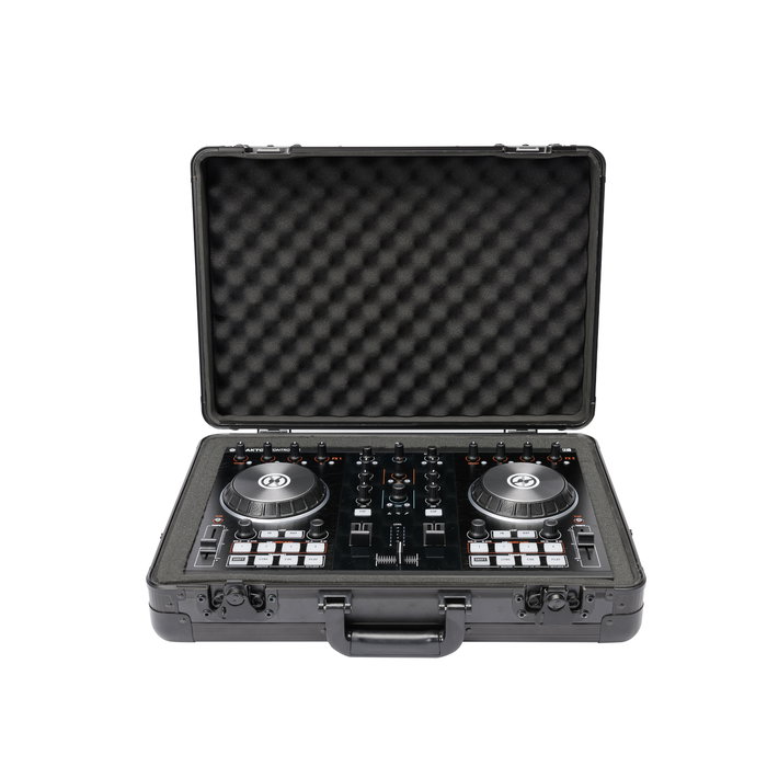 Maleta para controladores de tamaño medio. Construcción en MDF laminado y perfiles de aluminio anodizado, con cierres de mariposa (pueden asegurarse con candado). Interior completamente acolchado con espuma EVA de 5 mm EVA y espuma con relieve de 3 cm de grosor en la tapa. Incluye piezas de espuma de 2,5 y 3,5 cm) para crear compartimentos para controladores, mezcladores de batalla, portátiles o pequeños accesorios. Cómoda asa de trasporte y opción de añadir una correa. Medidas: exterior 37,5 x 51 x 16 cm, interior 33 x 48 x 11 cm. Peso: 3,5 kg