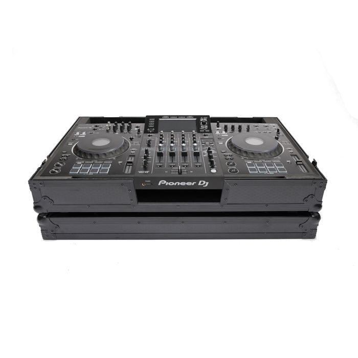 Flightcase para Pioneer XDJ-XZ de construcción robusta en chapa de vinilo laminado de 9 mm. Perfiles sólidos de elegante aluminio negro y cierres de mariposa retráctiles. 3 asas de transporte. Interior completamente acolchado que mantiene el controlador bien protegido. Panel frontal desmontable. Incluye ruedas. pies de góma sólida.