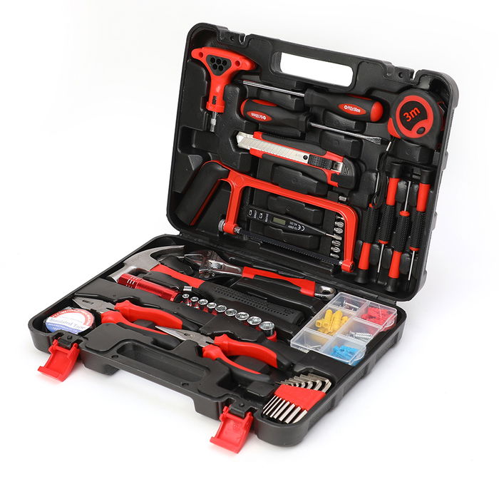 Conjunto de herramientas de 46 piezas que incluye: un destornillador sl5 8 x 100 mm un destornillador ph5 8 x 100 mm cuatro destornilladores de precisión (+2,5 -2,5 +3,0 -3.0) un cúter, un buscapolos un rollo de cinta aislante un mango de carraca nueve llaves allen de 1/4 (5 6 7 8 9 10 11 12 13), nueve puntas de 25 mm un portapuntas ocho vasos hexagonales (1,5 2 2,5 3 4 5 5,5 6) una sierra pequeña una cinta métrica 3 m un alicate de punta de 6" un alicate combinado de 6" una llave inglesa de 8" un martillo una linterna una caja tacos y tornillos de 60 unidades un maletín