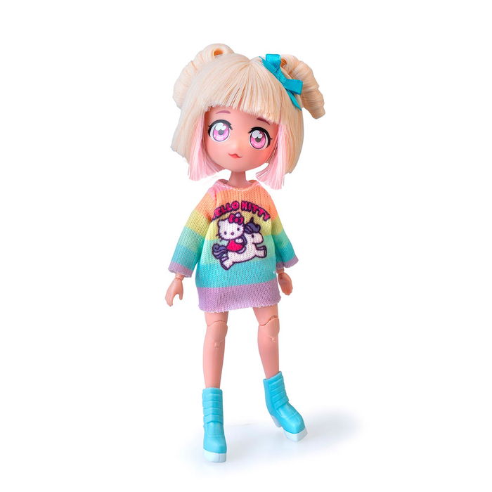 Set de muñeca fashion japonés de Hello Kitty con un outfit extra. La figura mide 19.5cm y tiene 15 puntos de articulación. La muñeca viste con el look fashion Unicorns de la moda manga actual japonesa. Lleva un vestido de los colores del arcoiris decorado con Hello Kitty montada en un unicornio. El outfit extra incluye una falda ra-ra, calentadoras y una diadema con orejas.