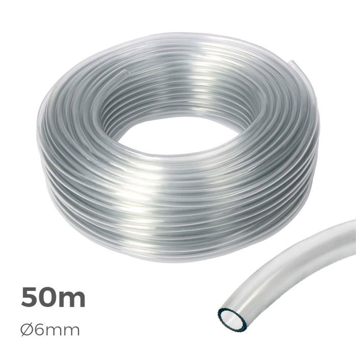 Manguera de cristal transparente 50 m (6 mm), manguera flexible pvc, 1 capa, presión servicio: 4 bar. resistente a los rayos uv. temperatura de uso: -10°/+60°