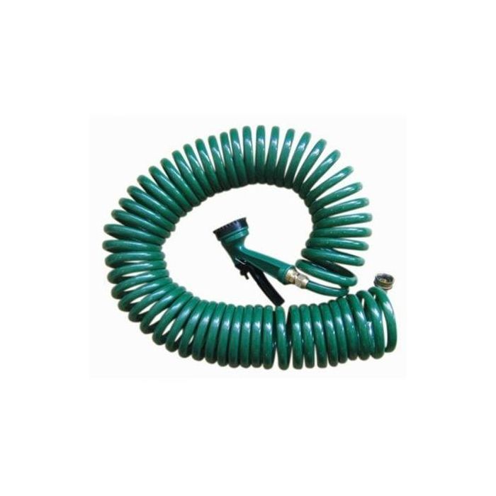 MANGUERA EN ESPIRAL JOCCA 1302 - 15 METROS - DIÁMETRO 8.5MM - CONECTOR + 2 ARANDELAS - INCLUYE PISTOLA CON 7 POSICIONES DE SALIDA DE AGUA