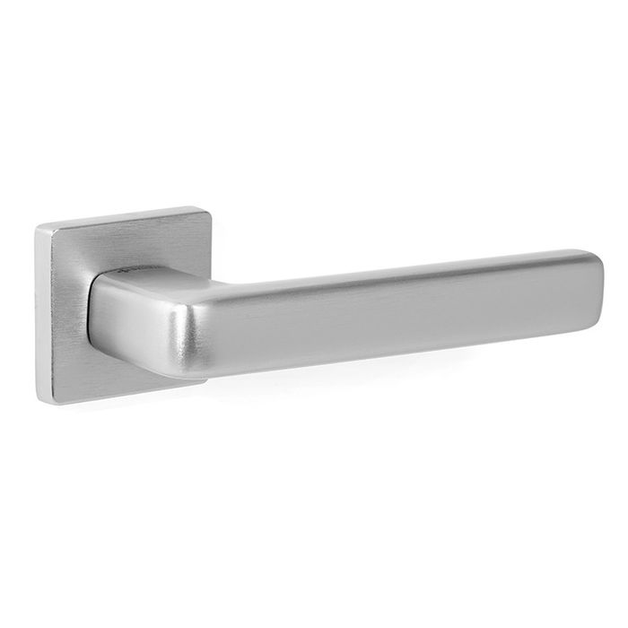 Manivela con roseta modelo Gamma en material zamak. Esta manivela con roseta cuadrada está disponible en acabado negro mate y en cromo. Son manillas ligeras con formas cuadradas con cantos redondeados.