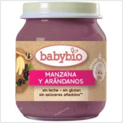 Potito de manzana y arándanos para bebes a partir de 4 meses. Babybio selecciona cuidadosamente sus ingredientes, 100% procedentes de agricultura ecológica.