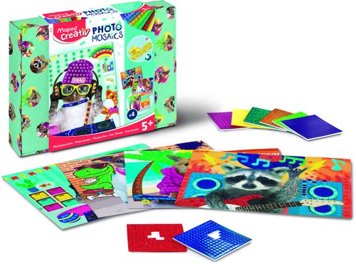 Set Photomosaics con 4 tableros con imágenes de divertidos animales a los que puedes añadirle color y mosaicos de colores autoadhesivas, así obtendrás fantásticos cuadros con mosaicos de colores. Una caja de cartón decorativa, colorida y práctica servirá para guardar todas tus obras de arte. Contiene: 4 tableros coloridos con animales divertidos (2 perros, 1 gatito y 1 conejito) + 8 hojas con cuadrados autoadhesivos en diferentes colores. Edad: + 5 años.