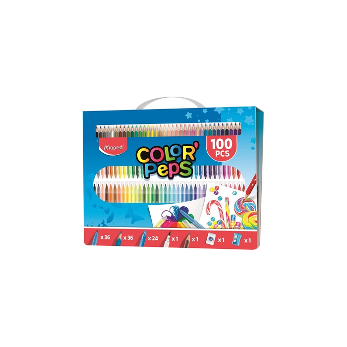Maletin Maped Coloring Color Peps 100 Piezas 36X Lapices De Colores 36X Rotuladores De Colores 24X Ceras Wax 1X Rotulador Punta Pincel 1X Lapiz De Grafito 1X Afila Lapiz 1X Goma