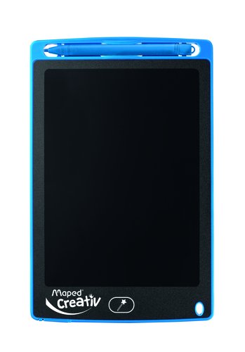 Tablero de dibujo y escritura LCD Maped Creativ TABLETA MÁGICA, azul La pantalla se puede eliminar como por arte de magia con solo presionar un botón , es posible bloquear la pantalla con un botón en la parte posterior , con presilla para colgar, incluye lápiz y celda de botón CR2016 Dimensiones: ( Ancho) 148 x (profundidad) 5 x (alto) 228 mm