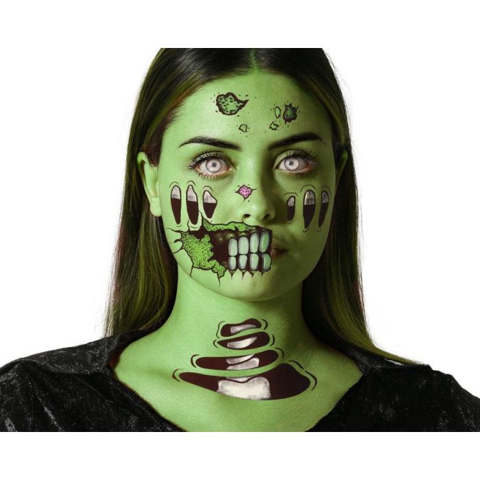 Maquillaje Tatuaje Facial Zombie Con Dientes Verdes Y Huesos Expuestos Halloween