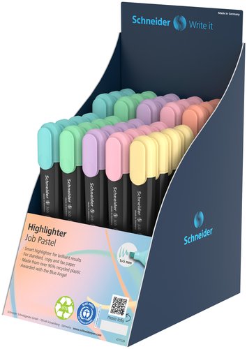 Resaltador con punta biselada 1-5 mm, cuerpo de PP, que no permite la evaporación de la tinta, capuchón con clip es reversible y colores vivos. El resaltador Job es ideal para la escuela, la universidad o la oficina y, también es perfecto para el trabajo creativo en agendas o para la caligrafía en el handlettering. Su tinta es apta para papel normal, para fotocopias, fax y es resistente a la luz.