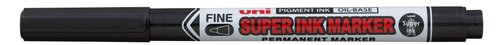 Marcador con cuerpo de plástico (PP) reciclado, tinta pigmentada base aceite y punta acrílica en forma de bala que deja un trazo de 0,9 mm. Un marcador con tinta Uni Super Ink ideal para escribir en la mayoría de las superficies, como vidrio, cartón, plástico, tela...