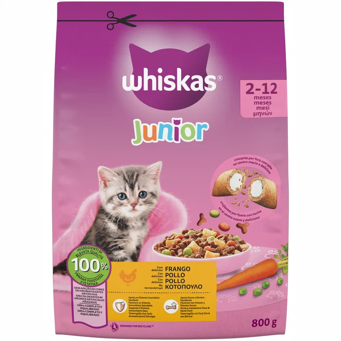 Alimento húmedo completo para gatos jóvenes Whiskas® Junior con sabor a pollo. Presentación en formato de 800 gramos, ideal para satisfacer las necesidades nutricionales de tu gatito durante su etapa de crecimiento. Formulado con ingredientes de calidad para apoyar un desarrollo saludable. Marca: Mars.