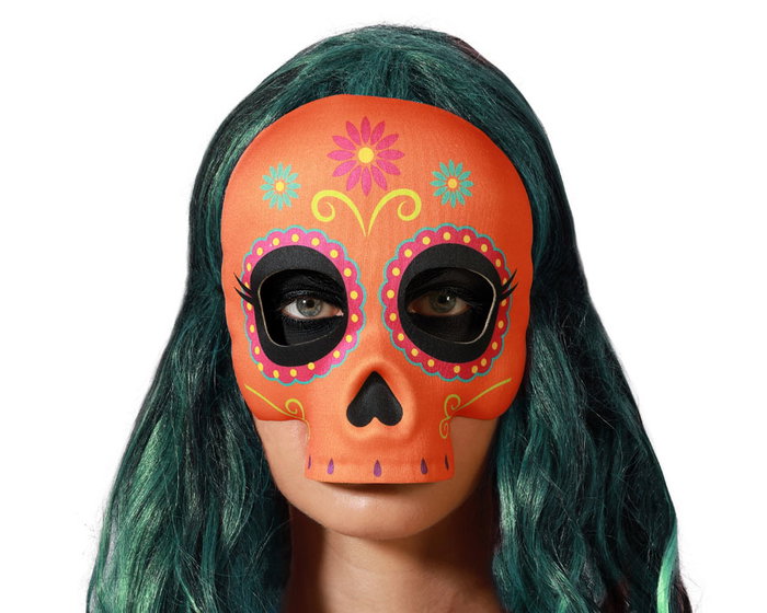 Esta alegre máscara naranja es perfecta para quienes desean un look colorido y divertido inspirado en las calaveras mexicanas. con sus flores y detalles en tonos vivos, transmite vida y tradición. ideal para comparsas, festivales y celebraciones culturales.